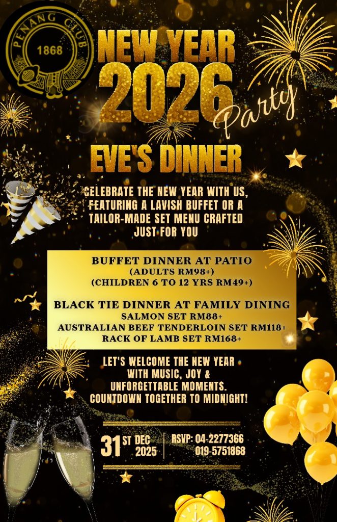 NEW YEAR 2026 EVE’S DINNER December 8, 2025December 8, 2025| adminadmin| 0 Comment | 3:29 pm Categories: Uncategorized DATE : 31 DECEMBER 2025LOCATION : PATIO Post navigation PREVIOUS Previous post: MERRY CHRISTMAS PENANG CLUB Related Post EXTENSION OF MCO 2.0EXTENSION OF MCO 2.0 Dear Members The Goverment has announced that the MCO 2.0 will be extended to 18 February 2021. Read MoreRead More MCO 2.0 CURRENT SOPS FOR USAGE OF GYMNASIUMMCO 2.0 CURRENT SOPS FOR USAGE OF GYMNASIUM Dear MembersThe government has announced that the gymnasium is permitted toresume operations, subject to strict Covid-19 prevention protocols. Read MoreRead More Christmas Buffet Lunch 25.12.24Christmas Buffet Lunch 25.12.24 Read MoreRead More